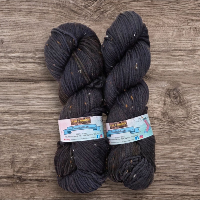 L' Audacieuse est un fil d'une douceur incomparable et un style unique avec son tweed Il s'agit du DK résistant avec son petit pourcentage de nylon , ..