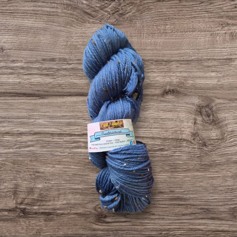 L' Audacieuse est un fil d'une douceur incomparable et un style unique avec son tweed Il s'agit du DK résistant avec son petit pourcentage de nylon , ..