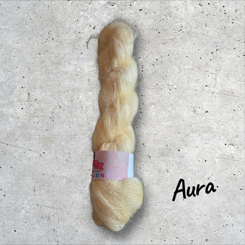 AURA, comme le halo subtil qui entoure une lumière ou une présence, donne son nom à ce fil d’exception. Léger, doux et lumineux, ce fil lace haut de gamme est composé de superkid mohair et de soie de mûrier. Idéal pour les tricots fins, ajourés ou en superposition, il se travaille seul, en double ou associé à un autre fil pour enrichir les textures.