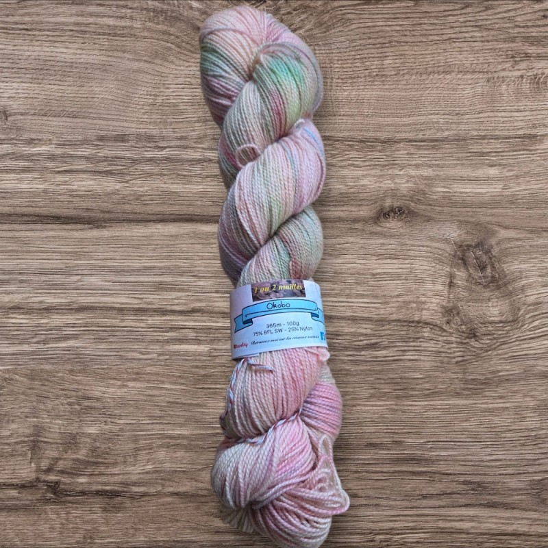 Okobo est un fil hautement résistant, idéal pour les projets qui demandent solidité et confort comme les chaussettes de randonnée. Composé de 75 % de laine Bluefaced Leicester superwash et 25 % de nylon, il combine douceur, élasticité et durabilité. Sa texture rebondie met en valeur les couleurs, même si elles paraissent légèrement plus douces que sur le mérinos.